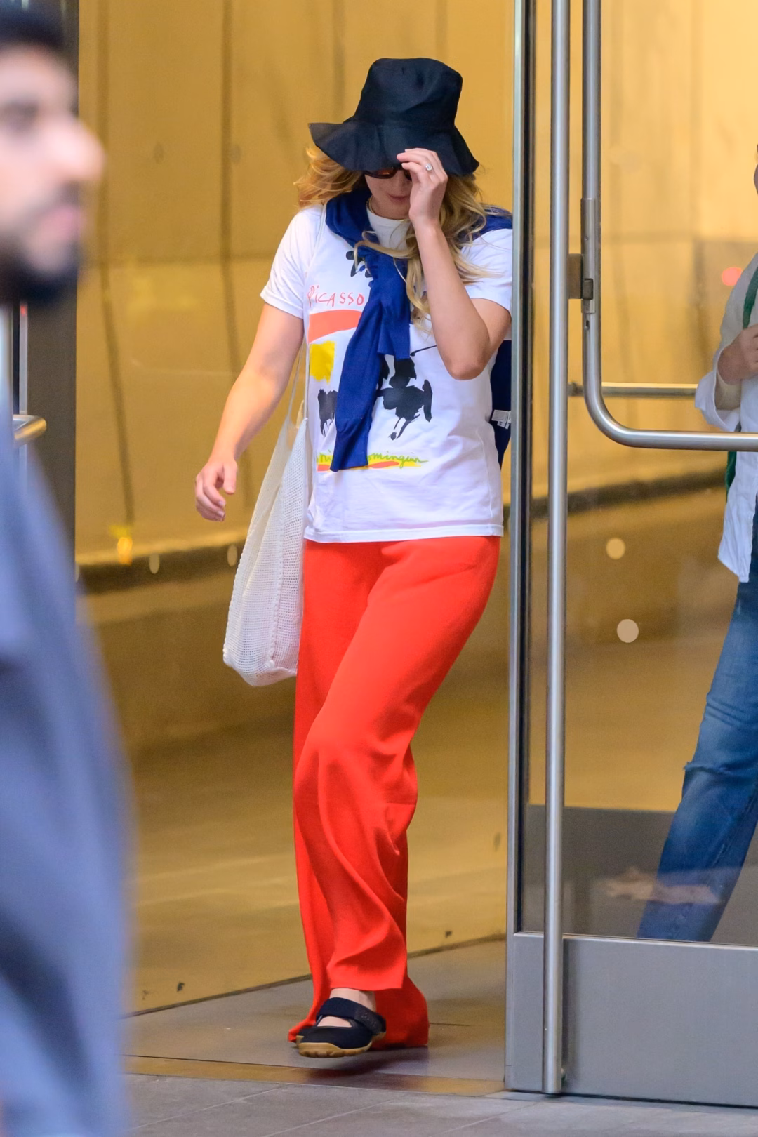 Nữ diễn viên đã chọn một chiếc túi tote màu kem thay vì một chiếc túi xách vintage đắt tiền, điều này cho thấy cô cũng chú ý đến sự thoải mái và thực tế trong việc lựa chọn phụ kiện. Cô cũng đã thêm một chiếc mũ bucket màu đen vào outfit của mình, tạo nên một phong cách thời trang đường phố ấn tượng. Phong cách này của Jennifer Lawrence đã thể hiện sự tự tin và thoải mái của cô trong việc đón nhận các xu hướng thời trang mới.