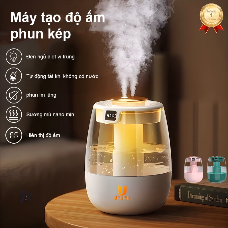 Một trong những sản phẩm máy tạo độ ẩm phun kép đáng chú ý là Máy tạo độ ẩm phun kép UPUPIN. Sản phẩm này có công suất lớn, màn hình LED hiển thị nhiệt độ và độ ẩm, cùng với đèn ngủ tiện dụng.