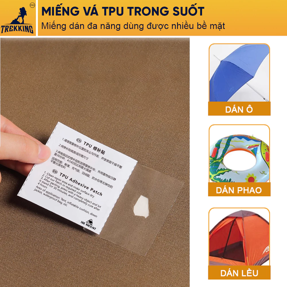 Miếng vá TPU trong suốt đa năng là một loại miếng vá được làm từ chất liệu TPU (Thermoplastic Polyurethane), một loại nhựa nhiệt dẻo có độ bền cao và khả năng chống nước tốt. Miếng vá này có thể được sử dụng để vá các loại lều, phao, áo mưa và các thiết bị khác bị bục hoặc thủng.