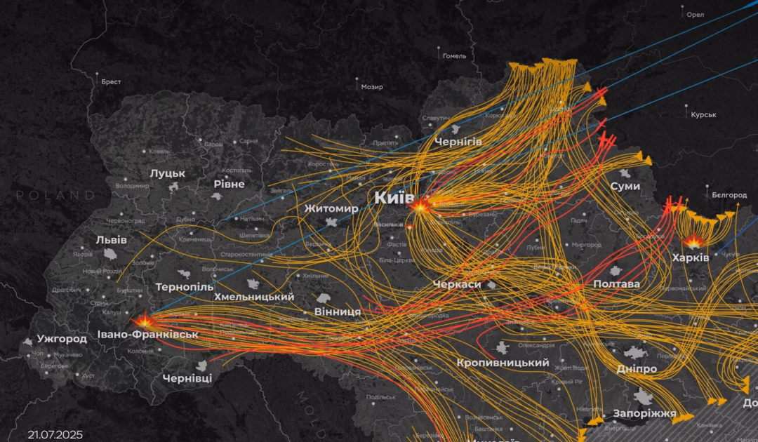 Không quân Ukraine đã thông báo rằng vào đêm ngày 20 và sáng sớm ngày 21/7, Nga đã thực hiện một cuộc tấn công quy mô lớn vào Ukraine. Trong cuộc tấn công này, Nga đã phóng tổng cộng 450 vũ khí trên không, bao gồm 426 máy bay không người lái (UAV) tấn công và mồi nhử, cùng 24 tên lửa. Đáng chú ý, trong số tên lửa được phóng, có 5 tên lửa đạn đạo Kh-47 M2 Kinzhal, 4 tên lửa hành trình Kalibr, 1 tên lửa hành trình Iskander-K và 14 tên lửa hành trình Kh-101.