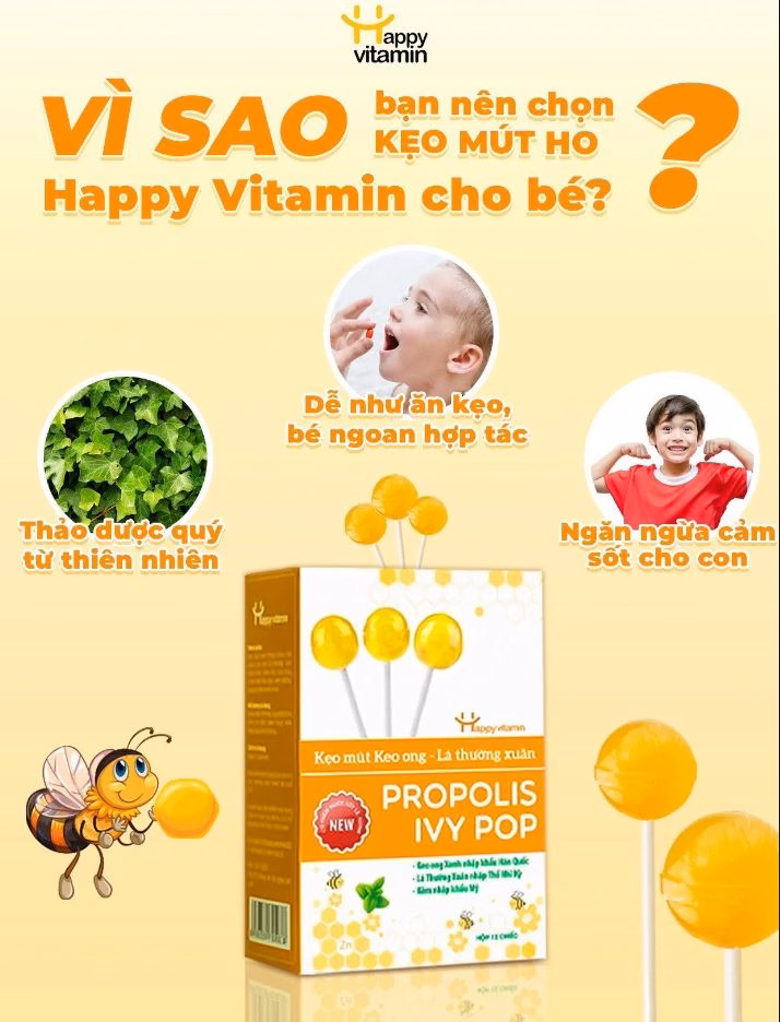 Kẹo mút ho Happy Vitamin là một sản phẩm kẹo mút ho được sản xuất với thành phần chính là keo ong và lá thường xuân. Keo ong là một chất tự nhiên có tính kháng khuẩn và kháng viêm cao, giúp bảo vệ vòm họng và giảm ho. Lá thường xuân cũng có tính kháng viêm và giúp làm giảm kích ứng ở vùng họng.